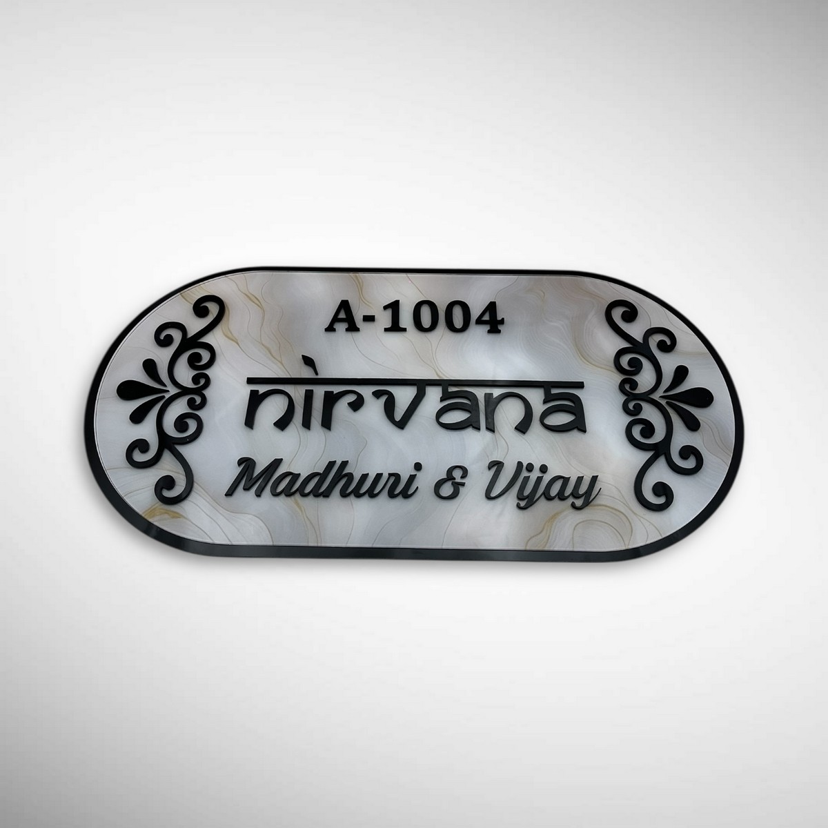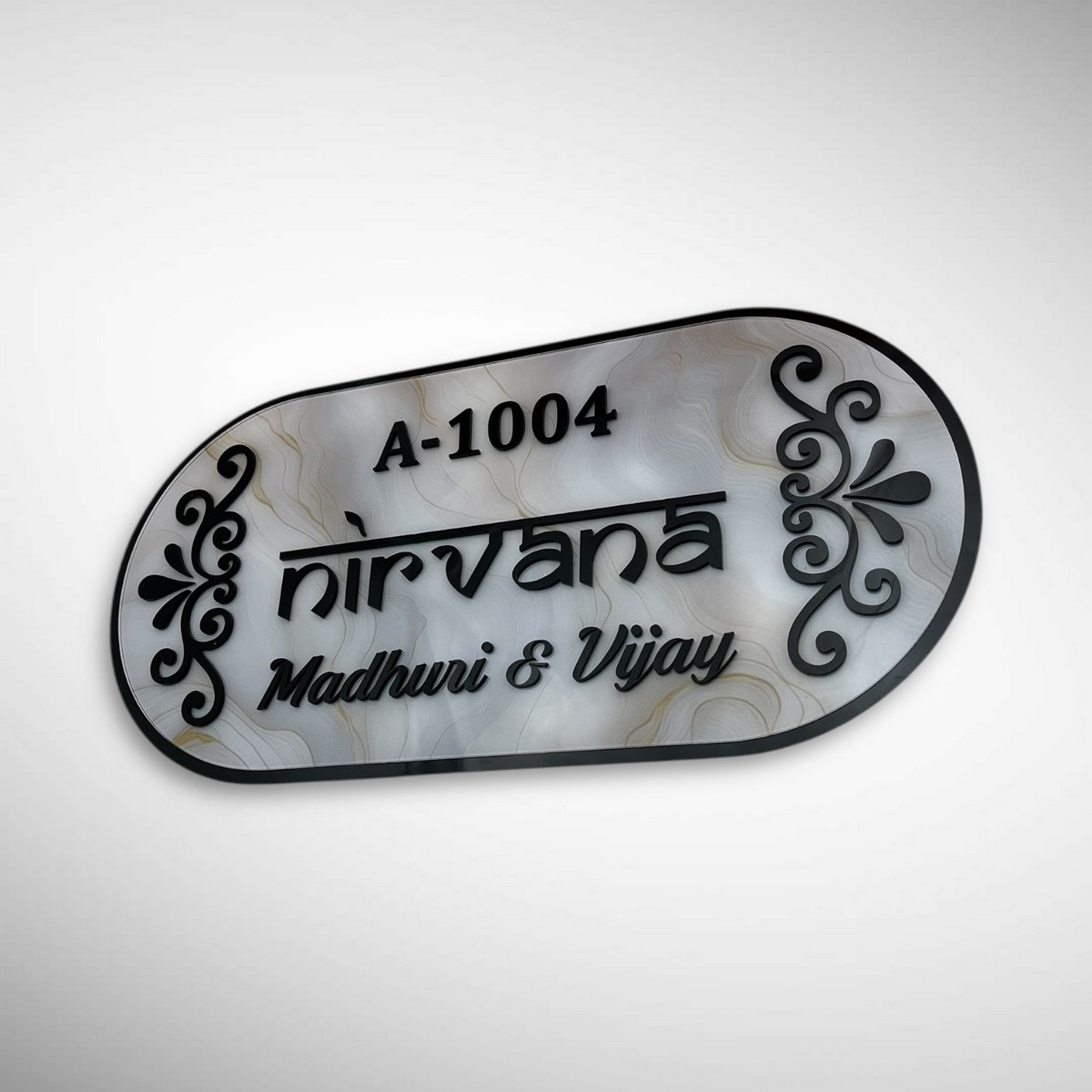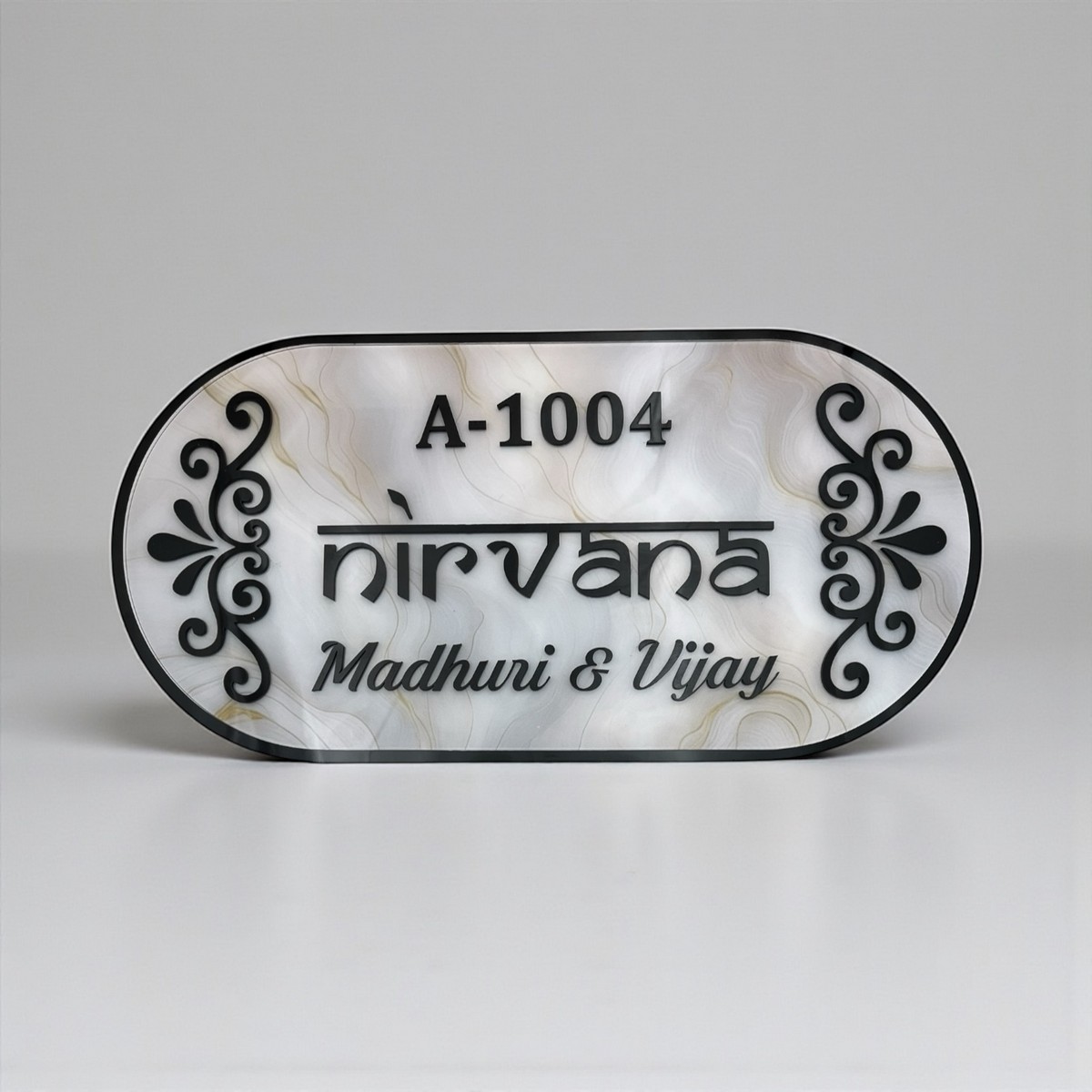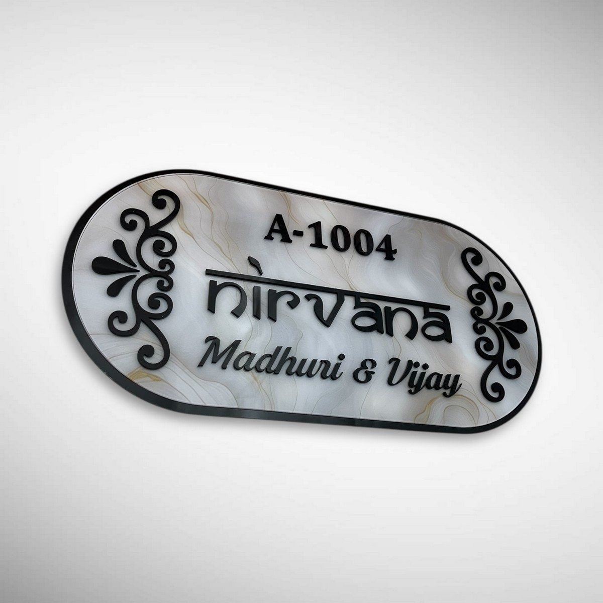 Transform your home entrance into a statement of elegance with our ACP-based Acrylic Nameplate featuring a stunning gold marble-effect background—Nirvana design edition ✨