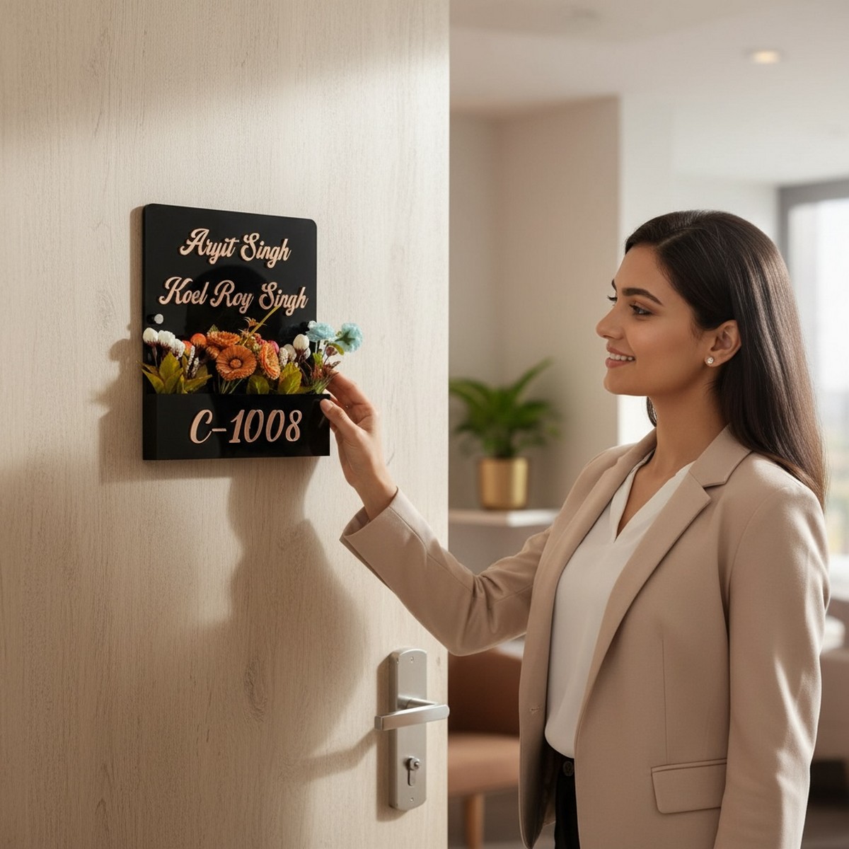 Crafted from high-quality black acrylic, the nameplate features a clean, premium finish that complements apartments, villas, offices, and modern Indian homes. The built-in planter space allows you to add real or artificial plants, bringing freshness and positivity to your entrance while making a bold design statement.