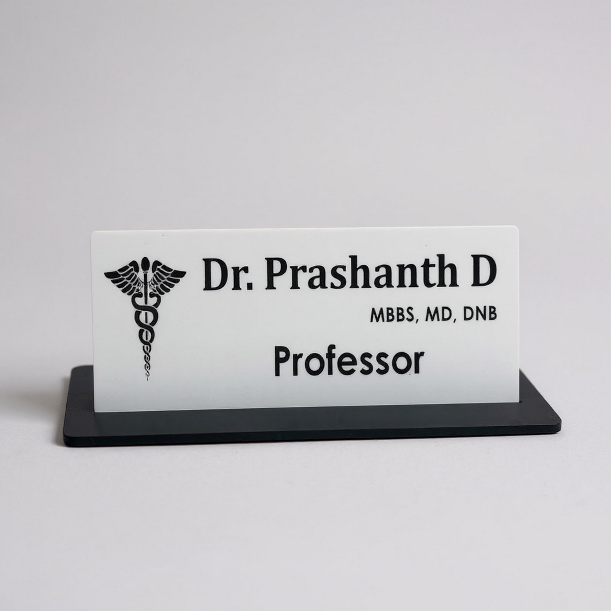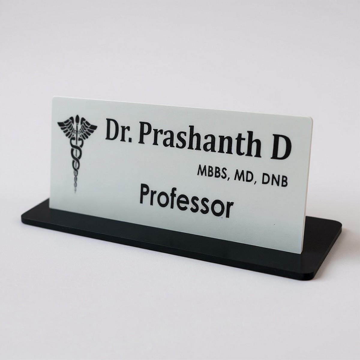 Crafted with premium-quality materials, the nameplate ensures durability, long-lasting shine, and easy maintenance. The crisp design highlights your name and designation clearly, making it perfect for reception counters, consultation rooms, and office desks.