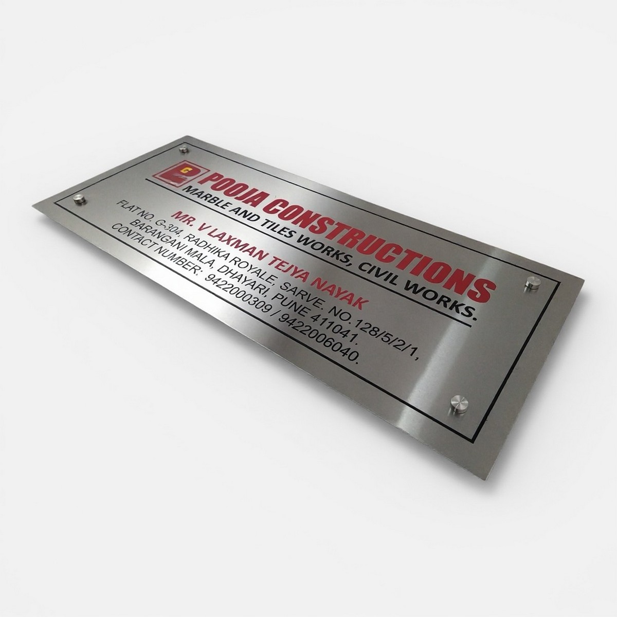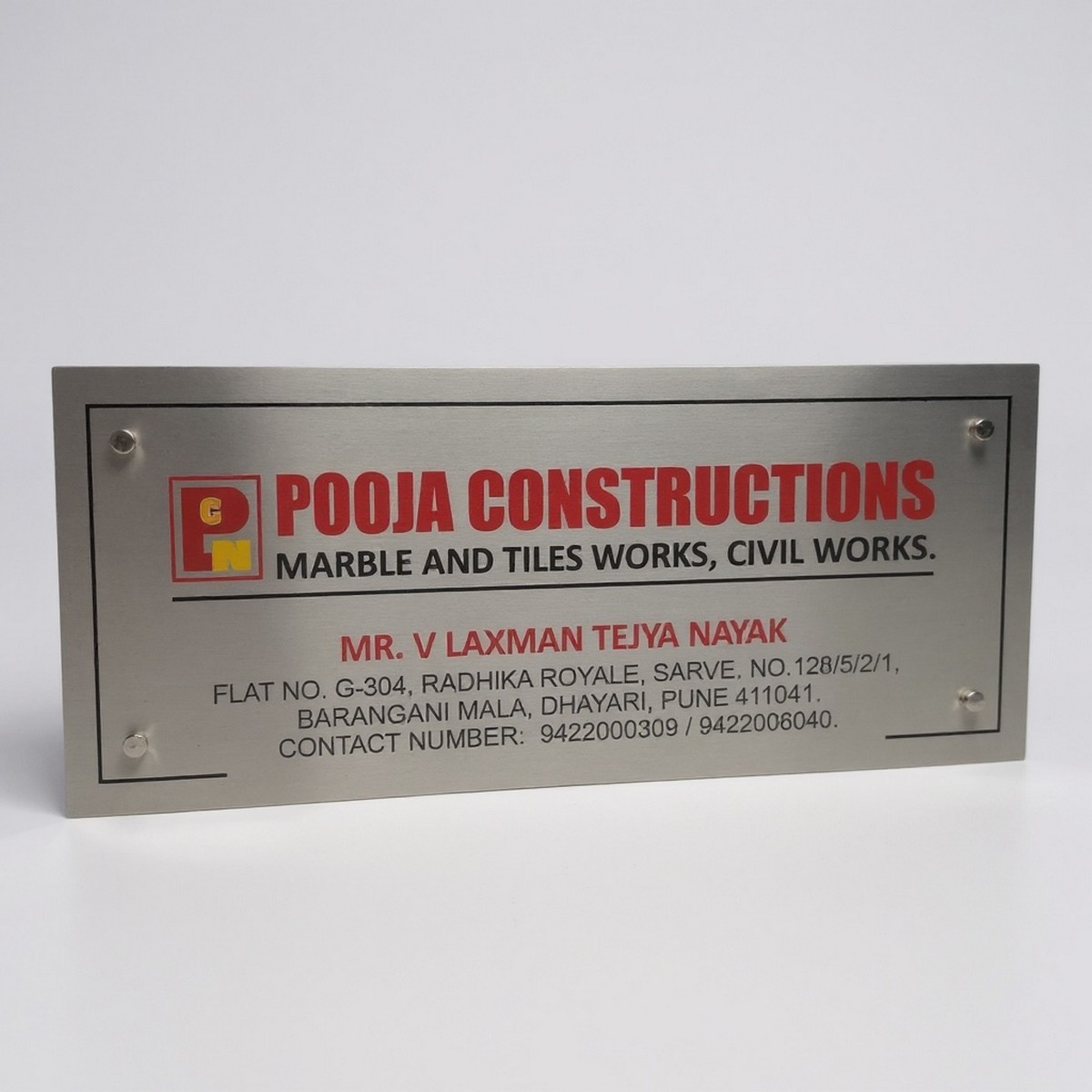 Customized with your company name, such as “Pooja Construction”, it showcases reliability and credibility to clients, partners, and visitors alike. Built to withstand harsh weather conditions, dust, and daily wear, this nameplate is a long-term branding investment for growing construction businesses.