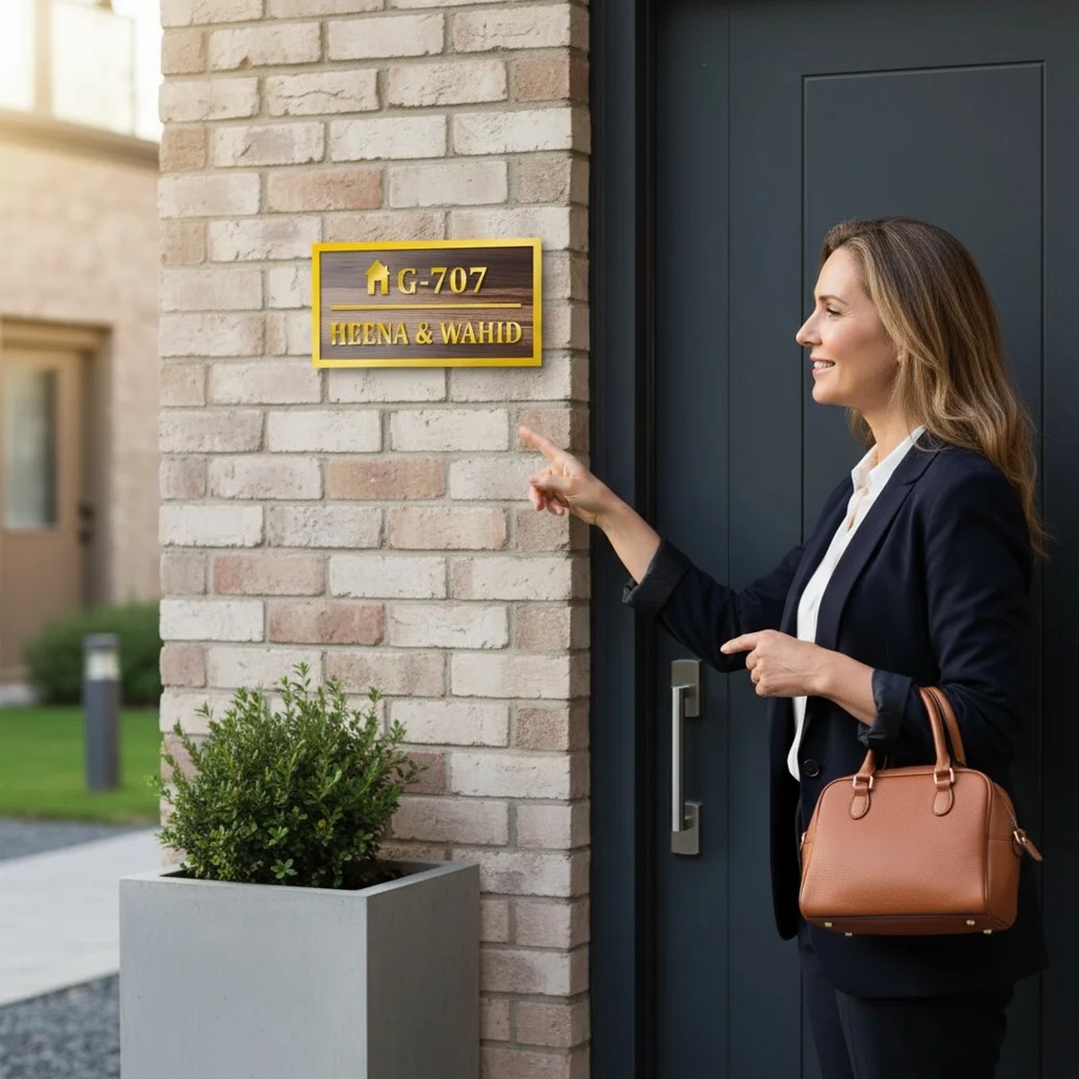 This wooden ACP-based nameplate with acrylic letters is a premium handcrafted house nameplate specially designed for modern Indian homes. Featuring the names Heena & Wahid, this design blends the warmth of wood with the sleek shine of acrylic, creating a stunning front-door decor piece.