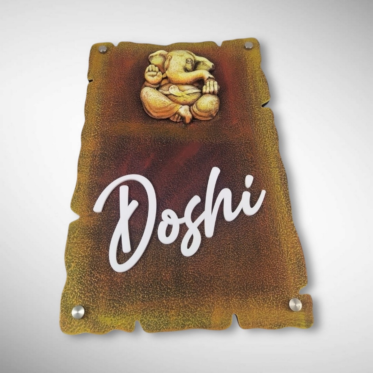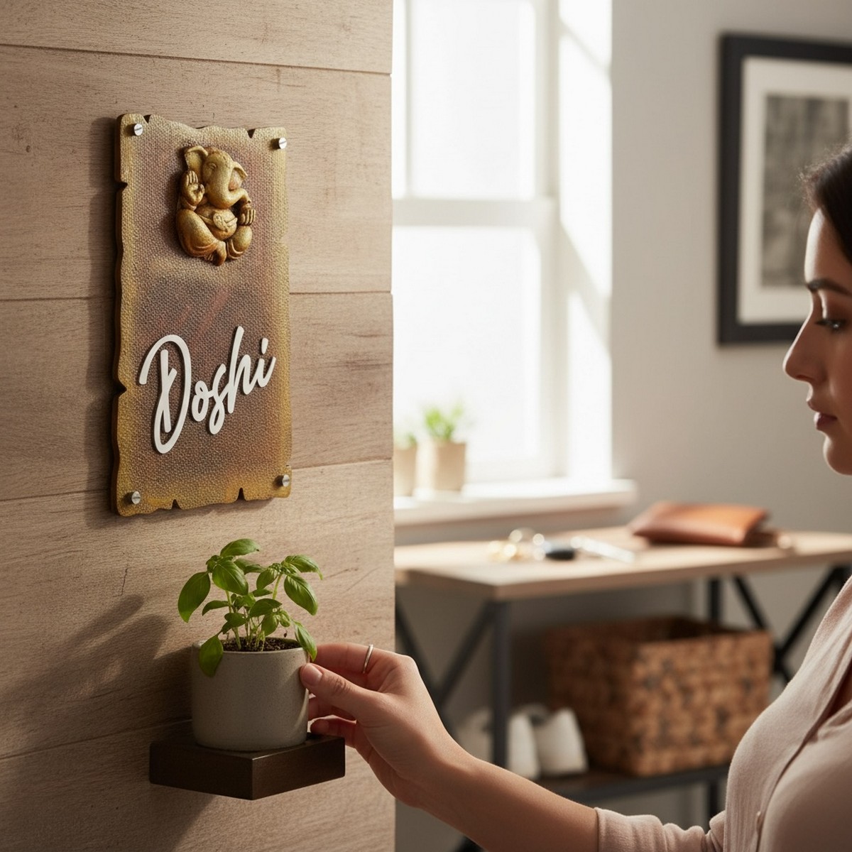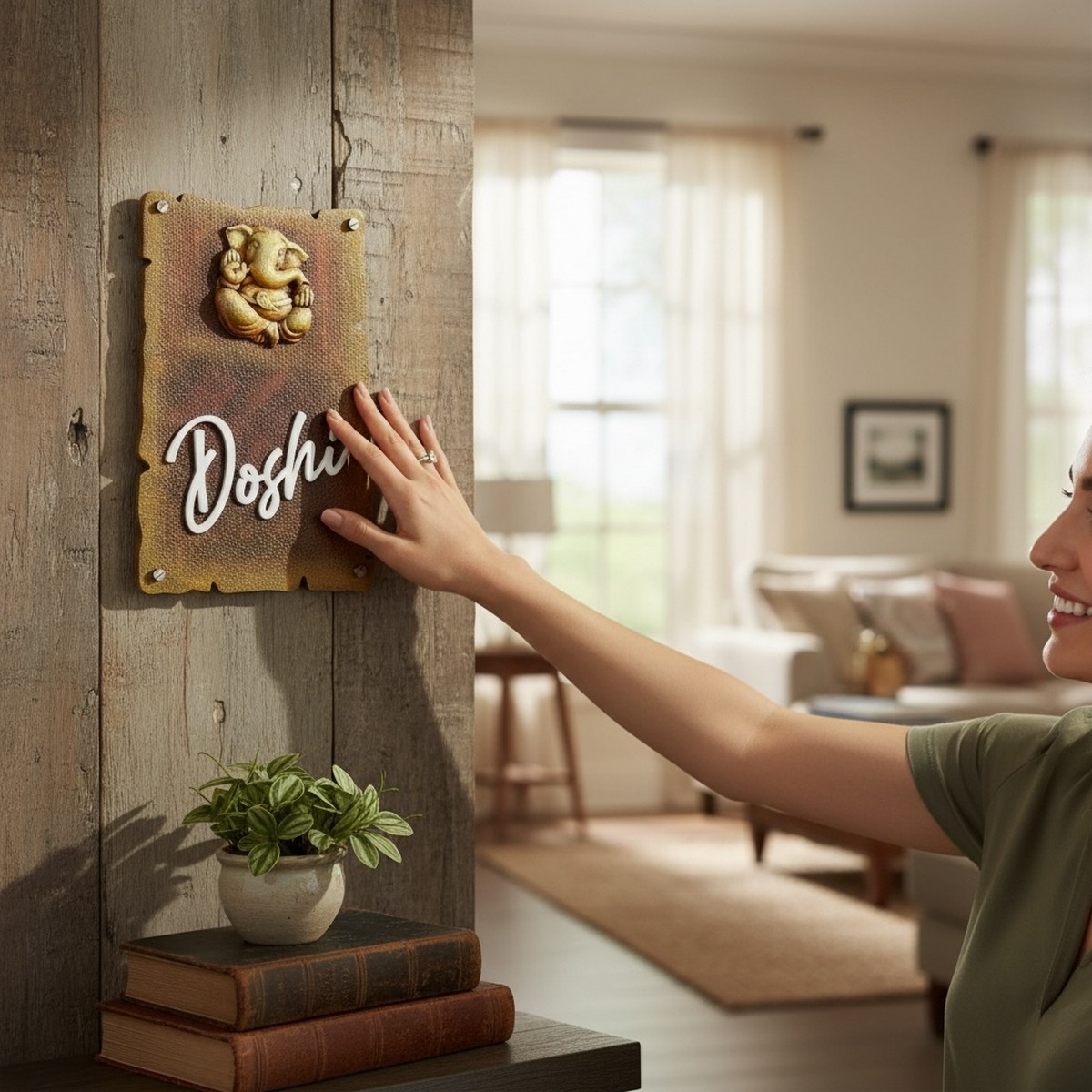 Bring divine blessings and artistic elegance to your home with the Divine Ganesh Murti Handcrafted Nameplate – Doshi. 🕉️✨