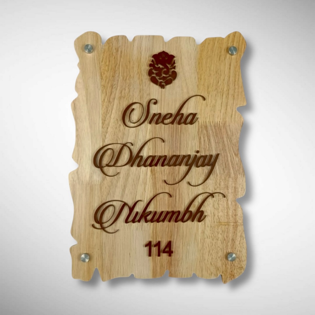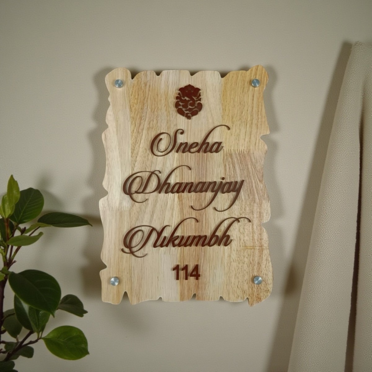 Carefully handcrafted by skilled Indian artisans, this wooden nameplate showcases natural wood textures paired with a clean, stylish design—making it a perfect statement piece for any home entrance.