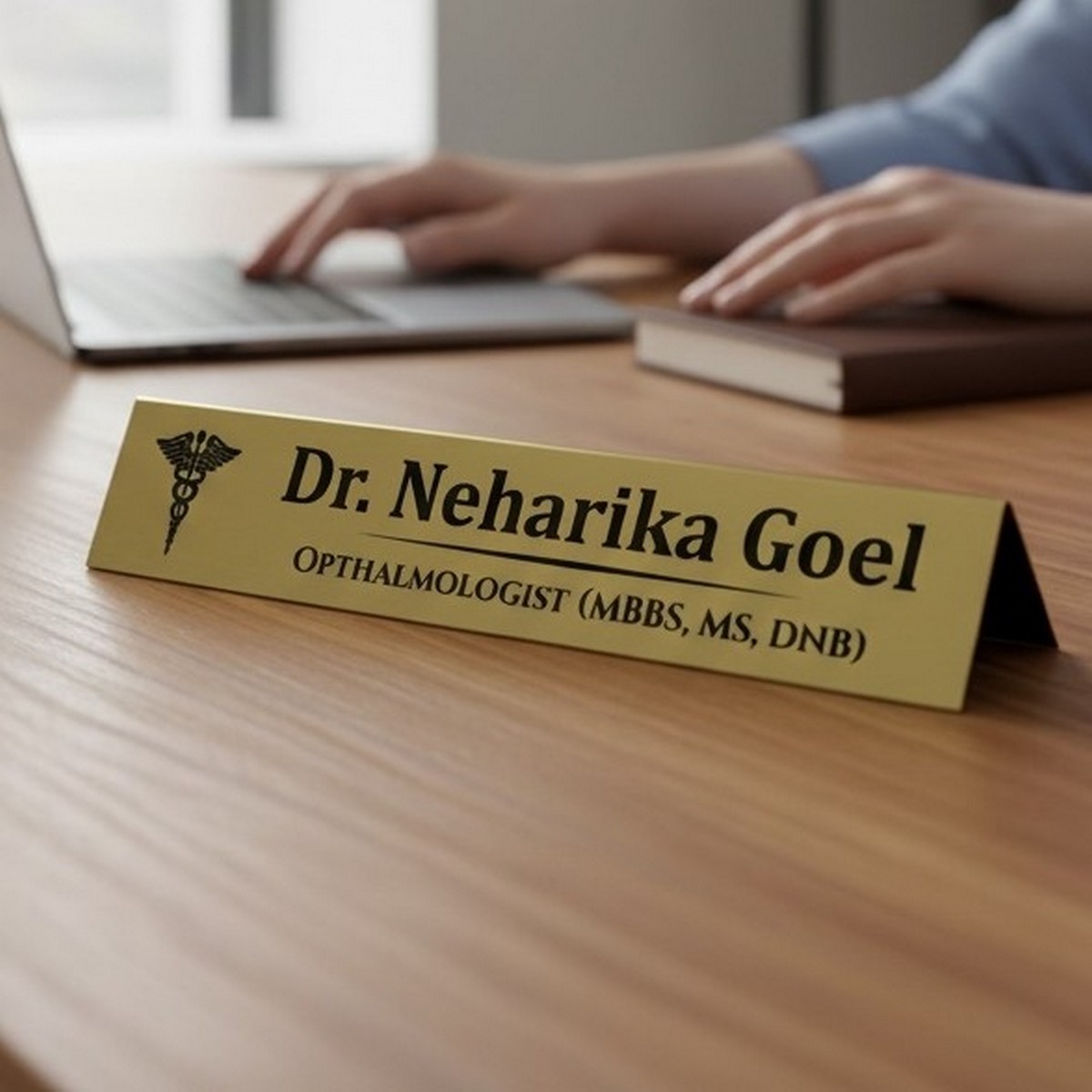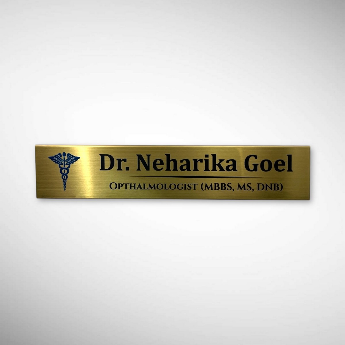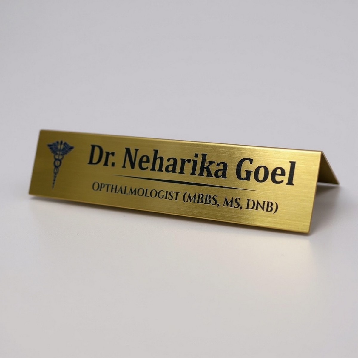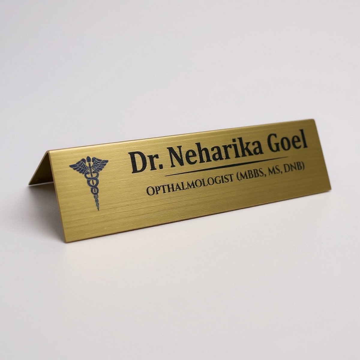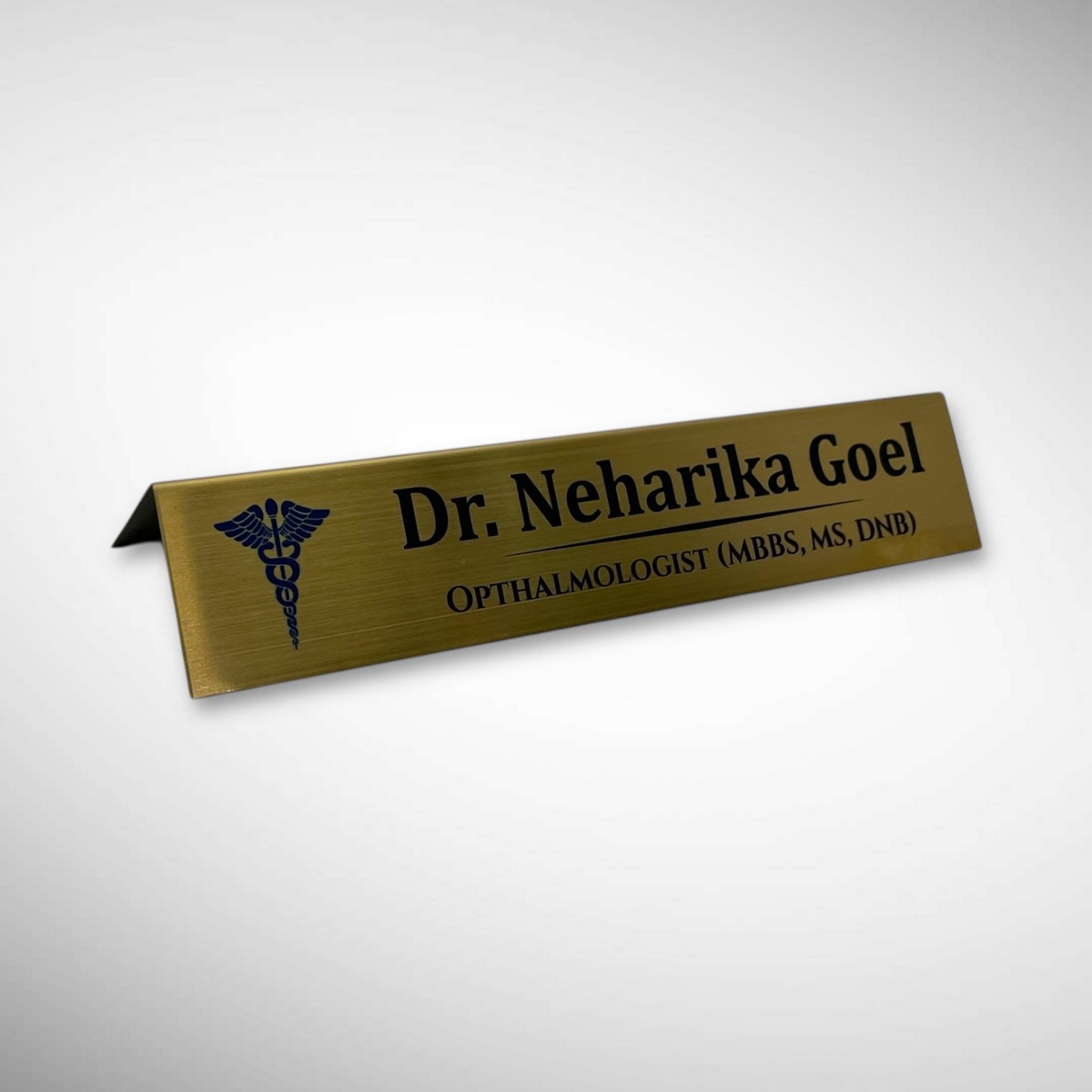 Crafted with a high-quality brushed metal finish, this nameplate features precision-engraved lettering that ensures long-lasting clarity and a sophisticated appearance. Whether placed in a clinic, corporate office, consultation room, or personal workspace, it reflects professionalism and premium taste.