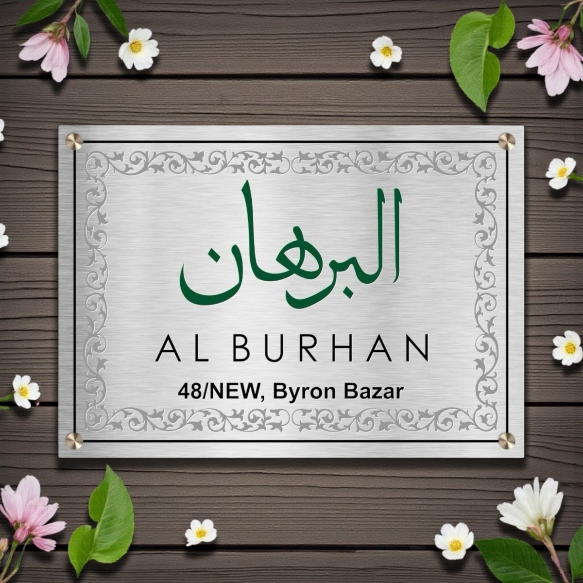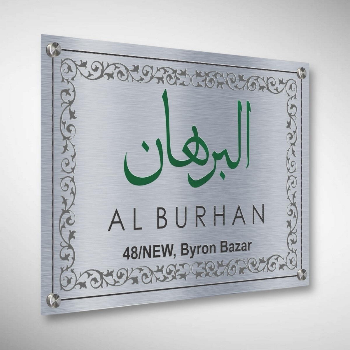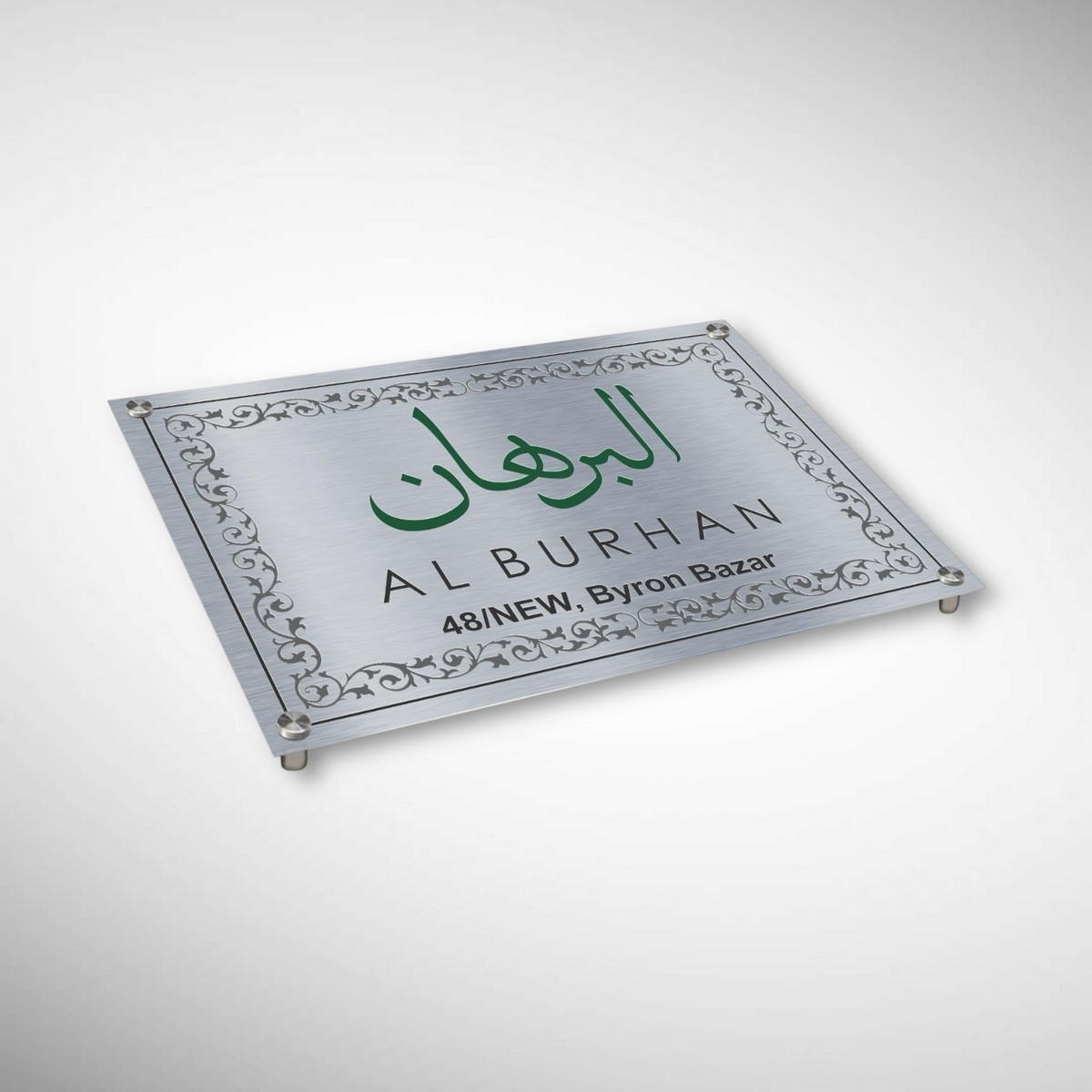 Crafted from high-grade stainless steel, the nameplate features precision etching that highlights the name Al Burhan with exceptional clarity and depth. The premium Duco paint finish enhances durability while adding a smooth, luxurious look that resists fading, rust, and weather damage—making it ideal for both indoor and outdoor use.