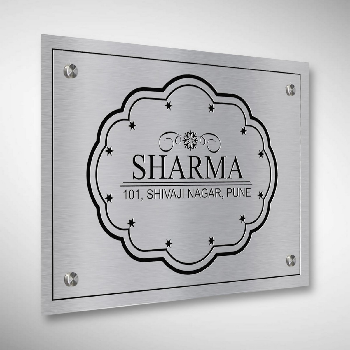 Add a touch of sophistication to your home entrance with our Stainless Steel Etched Sharma Nameplate, exquisitely finished with high-quality Duco paint for a rich, long-lasting look. Designed for modern Indian homes, this nameplate blends durability with refined aesthetics, making your entrance truly stand out.