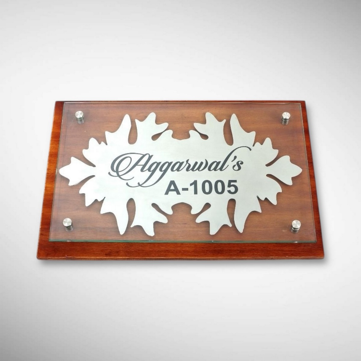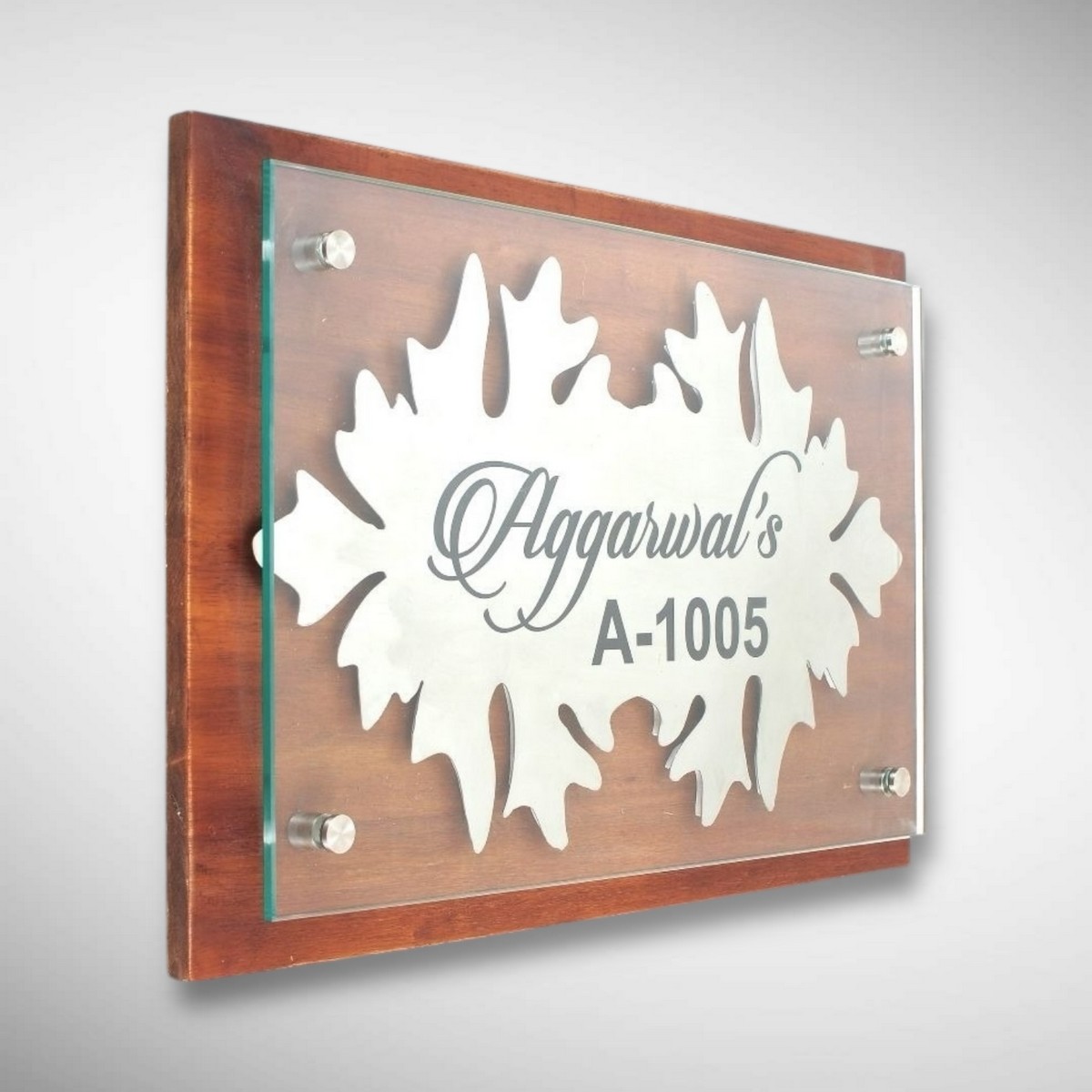 Stylish leaf theme stainless steel nameplate with personalized engraving. Elegant, durable & perfect for modern Indian homes. Order now!