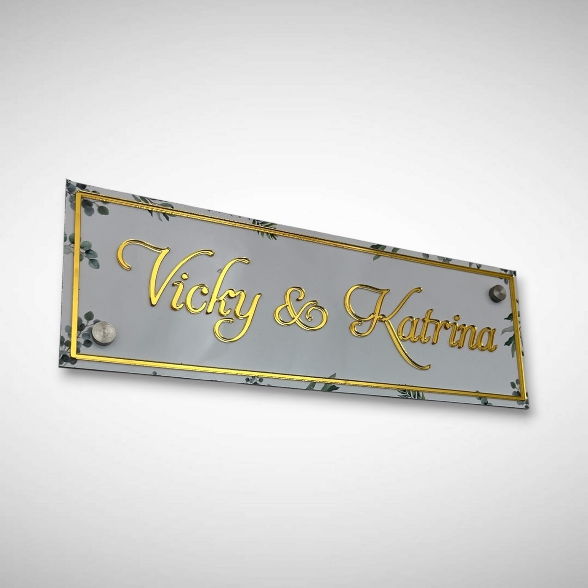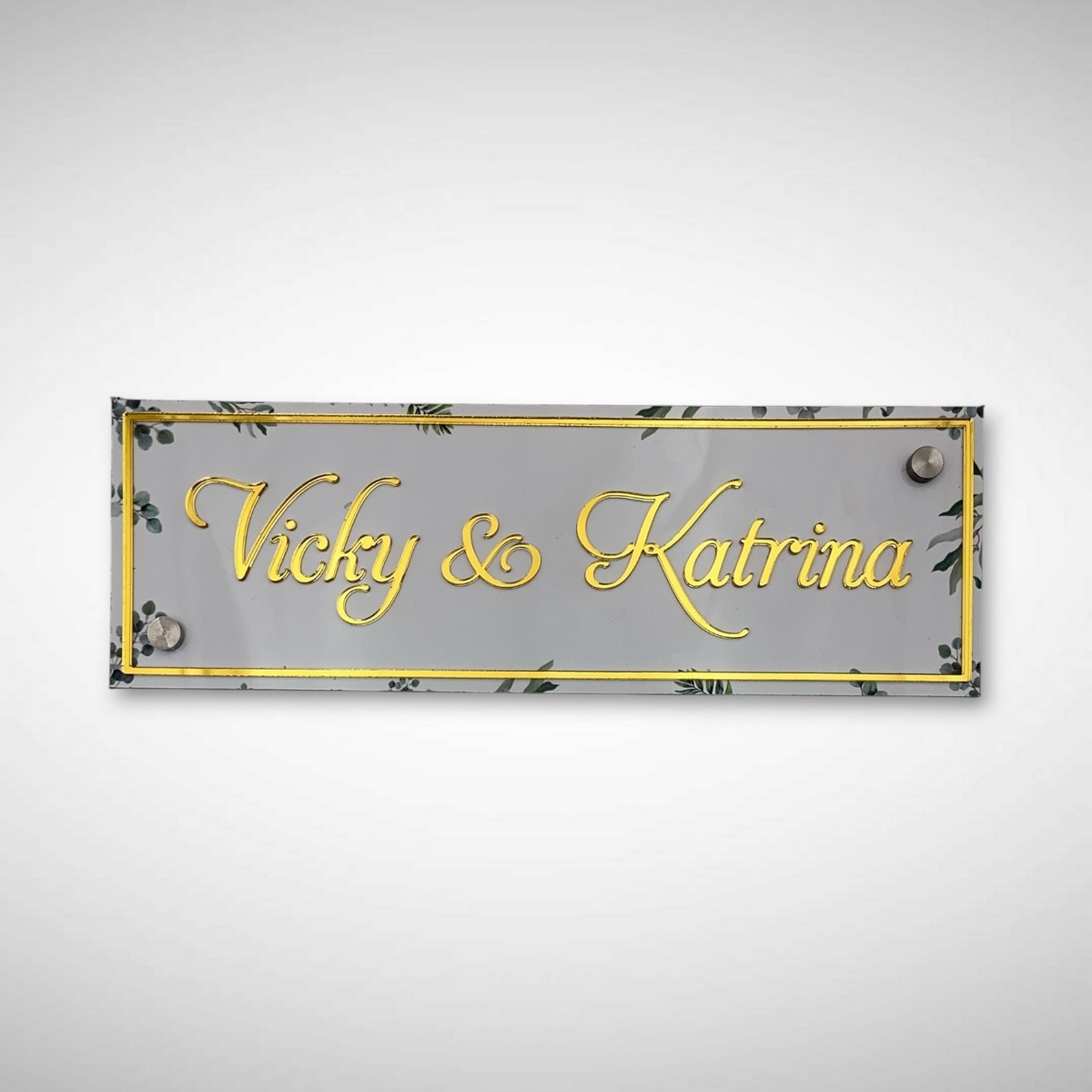 Add a touch of modern elegance to your home entrance with this UV-printed ACP-based nameplate featuring premium acrylic letters, customized beautifully with the names Vicky & Katrina. Designed for contemporary Indian homes, this nameplate combines durability, style, and personalization in one stunning piece.