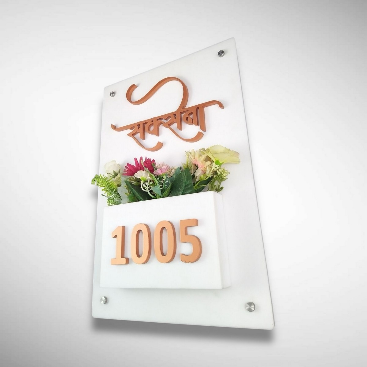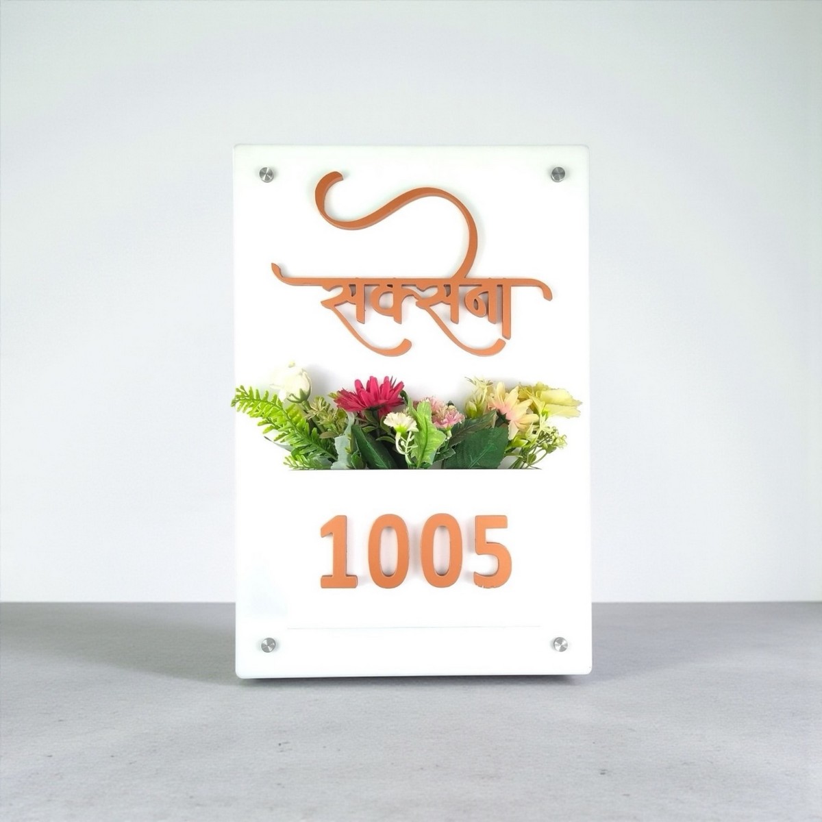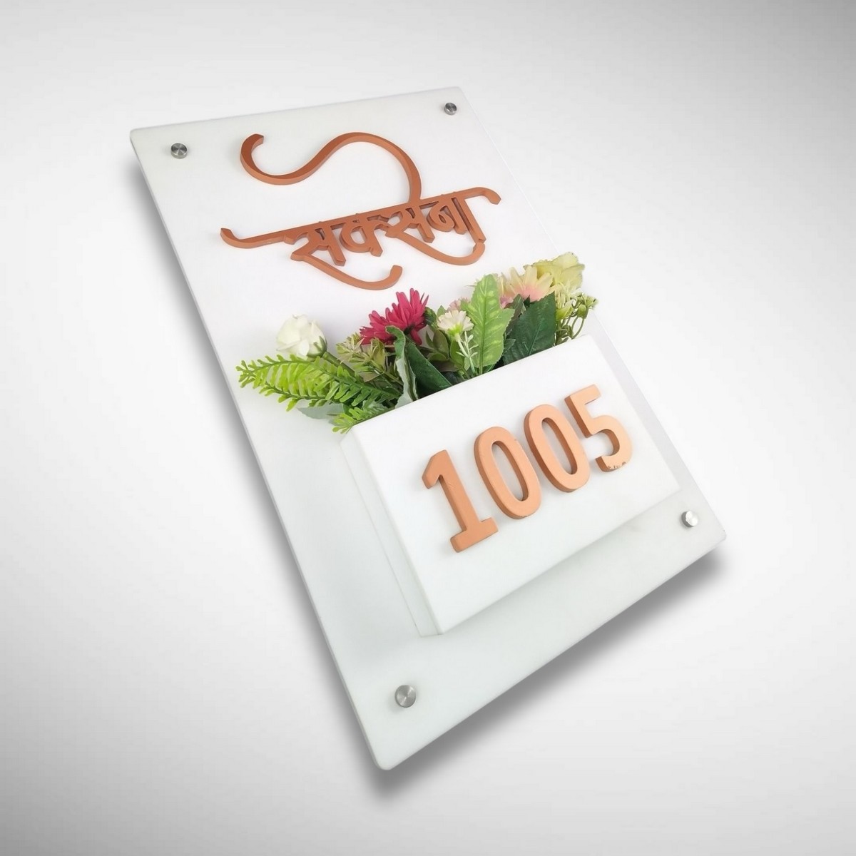 Crafted from high-quality white acrylic, this nameplate offers a sleek, glossy finish that enhances the look of apartments, villas, and independent homes. The built-in planter space allows you to add artificial or real plants, creating a warm and welcoming vibe for your guests 🌸🏡.
