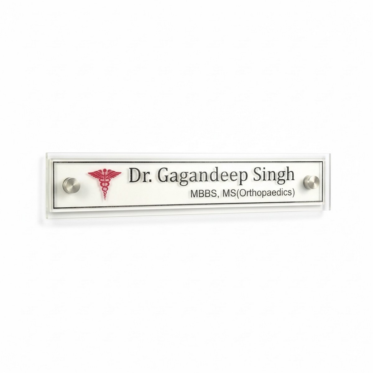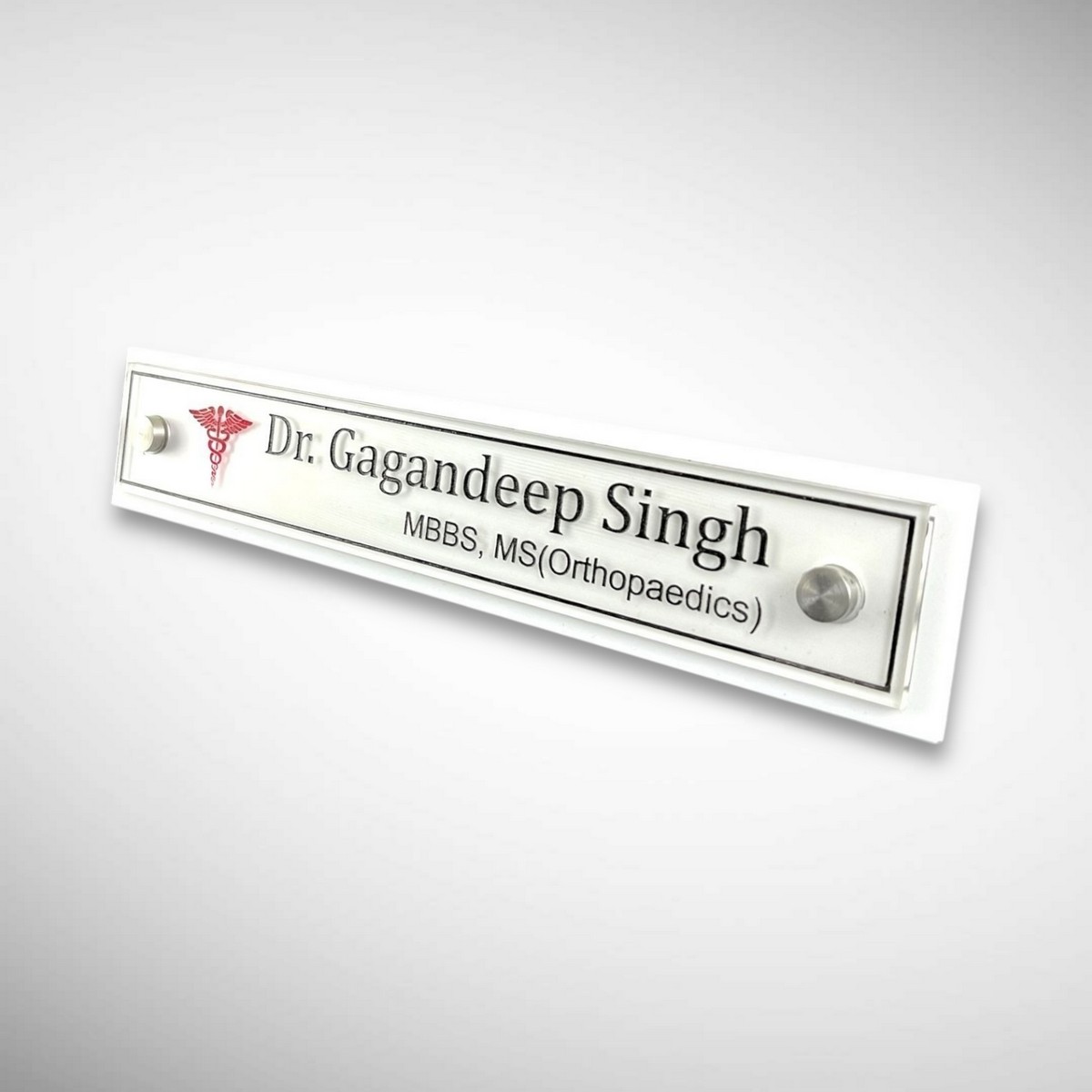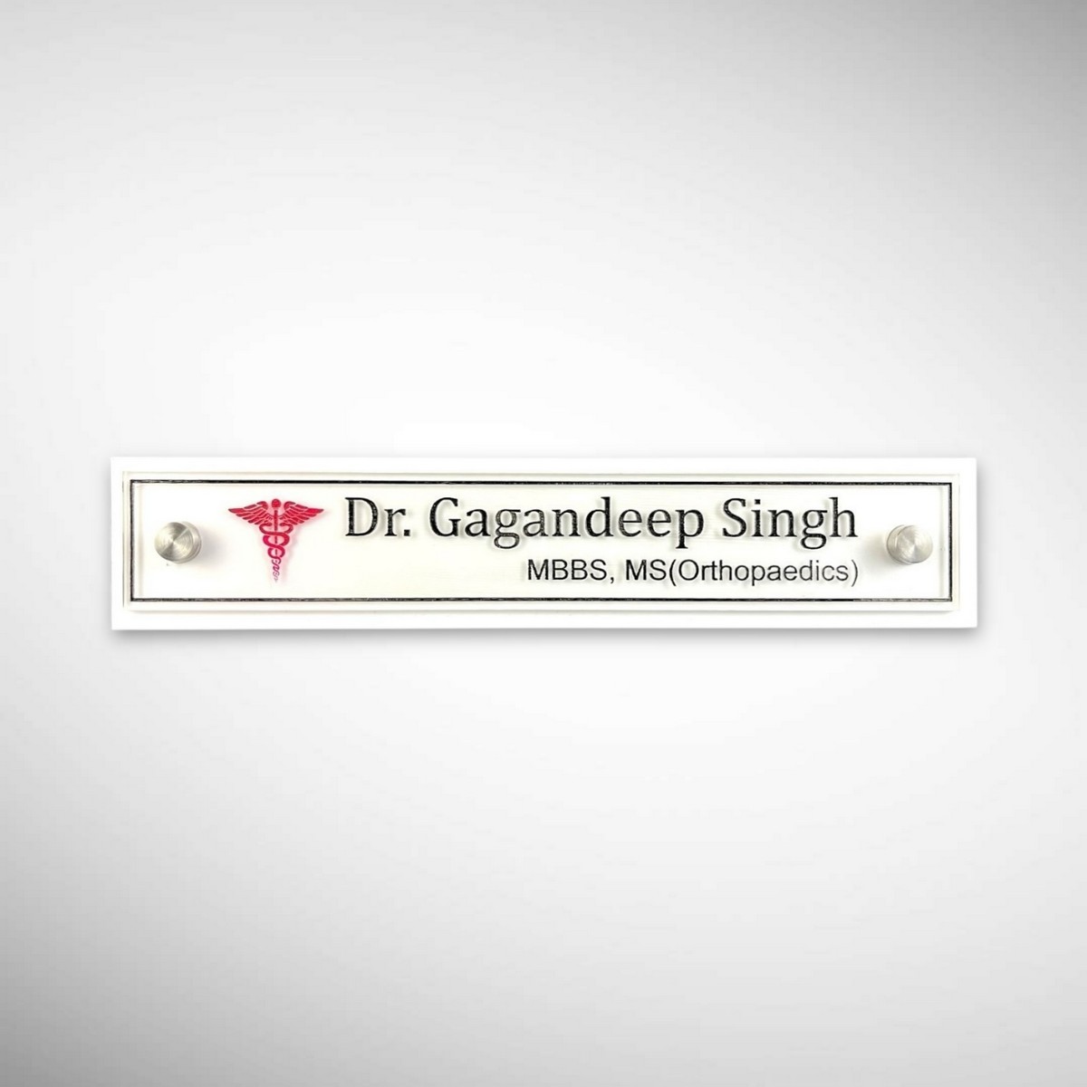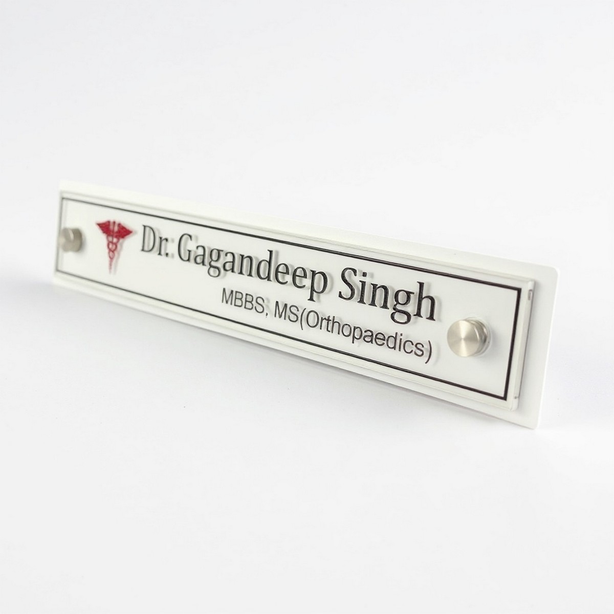 Crafted from premium-quality acrylic, this nameplate features a clean white base with sharp, readable lettering that instantly enhances the look of your desk, clinic, or office cabin. Its minimal yet sophisticated design reflects professionalism while keeping the focus on your name and designation.