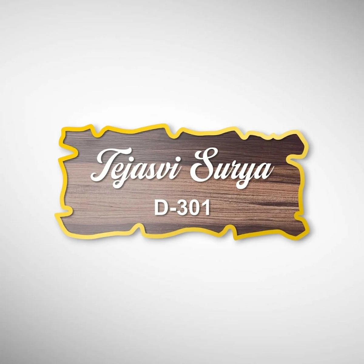 Welcome elegance to your entrance with our Wooden ACP Nameplate featuring Acrylic Letters—Tejasvi Surya design.